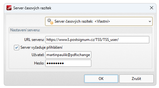 Po restartu PC zadejte přístupové údšaje znovu a vytvořte účet časových razítek v aplikaci PDF-XChange Editor.
