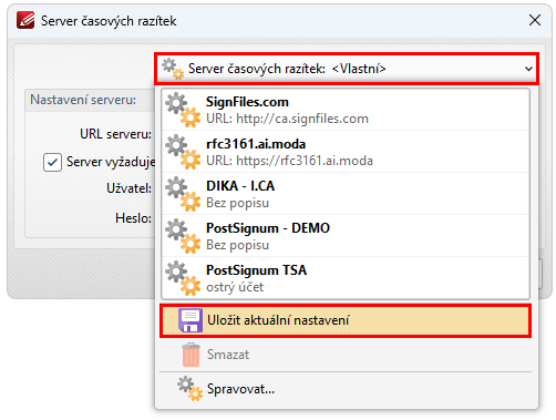 To uděláte tak, že rozkliknete rozbalovací seznam Server časových razítek: <Vlastní> a vyberete volbu Uložit aktuální nastavení.